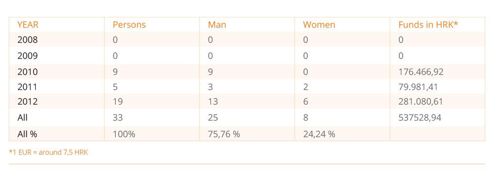In the frame of “National Plan for Employment for 2009 and 2010”, Regional Office Varaždin in cooperation with units of local government and NGOs started a public works programme. The scheme continued to operate in 2011-2013. District Employment Office Varaždin in 2009 planned to include 41 people in the public works program, but given the great interest for public works in Varaždin County, 109 people were employed. It was planned that in 2010 the public works programme would include 66 people, but given the great interest of local self-government and high-quality programme of public works in the Varaždin County employed 165 persons1. In the framework of the Public Works Employment Office, people who listed in the records as unemployed for 6 or 12 months were co-financed to 75 per cent of the gross minimum wage and people who were unemployed for more than 36 months minimum were funded 100 per cent of the minimum gross wages and received travel expenses to a maximum of 40 euros per month. People mainly worked on reconstructing and maintaining the municipal infrastructure, green areas and the welfare of the elderly.