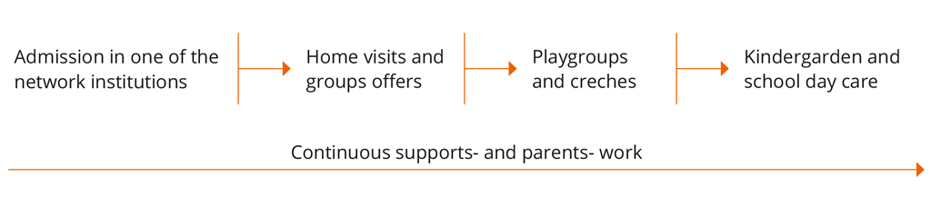 Primano is a pre-school education programme targeting disadvantaged children and their families in selected districts. It started in 2007 with a home-visit programme. Bern was the first commune to implement a Dutch programme named Opstapje. The idea of a pre-school programme arose as school nurses noticed that some children had difficulties in the very first year of school. In addition, these children showed speech difficulties, and social interaction and psychomotor problems that could be linked with the family structure and social environment. The Director of the Health, Education and Welfare2 Department was encouraging multidisciplinary work and tasked the health unit to implement a home-visit programme. The result is a pilot project in the stream of social investment, which includes, besides home visits, educations modules for child-care facilities, playgroups, and a coordination structure inside the districts. The programme aims to build a chain of support that accompanies children until kindergarten. The following steps constitute the chain.